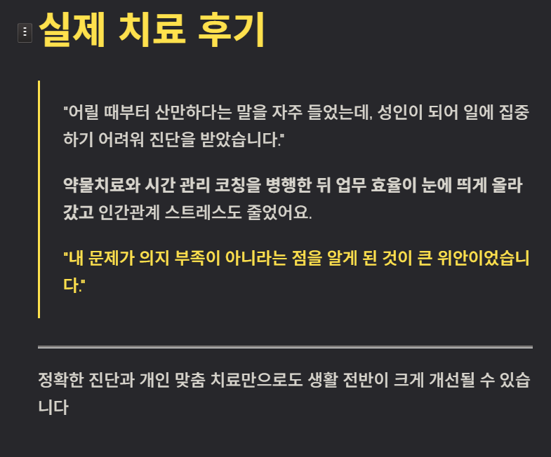 “어릴 때부터 산만하다는 말을 자주 들었는데, 성인이 되어 일에 집중하기 어려워 진단을 받았습니다. 약물치료와 시간 관리 코칭을 병행한 뒤 업무 효율이 눈에 띄게 올라갔고 인간관계 스트레스도 줄었어요. ‘내 문제가 의지 부족이 아니라는 점’을 알게 된 것이 큰 위안이었습니다.”