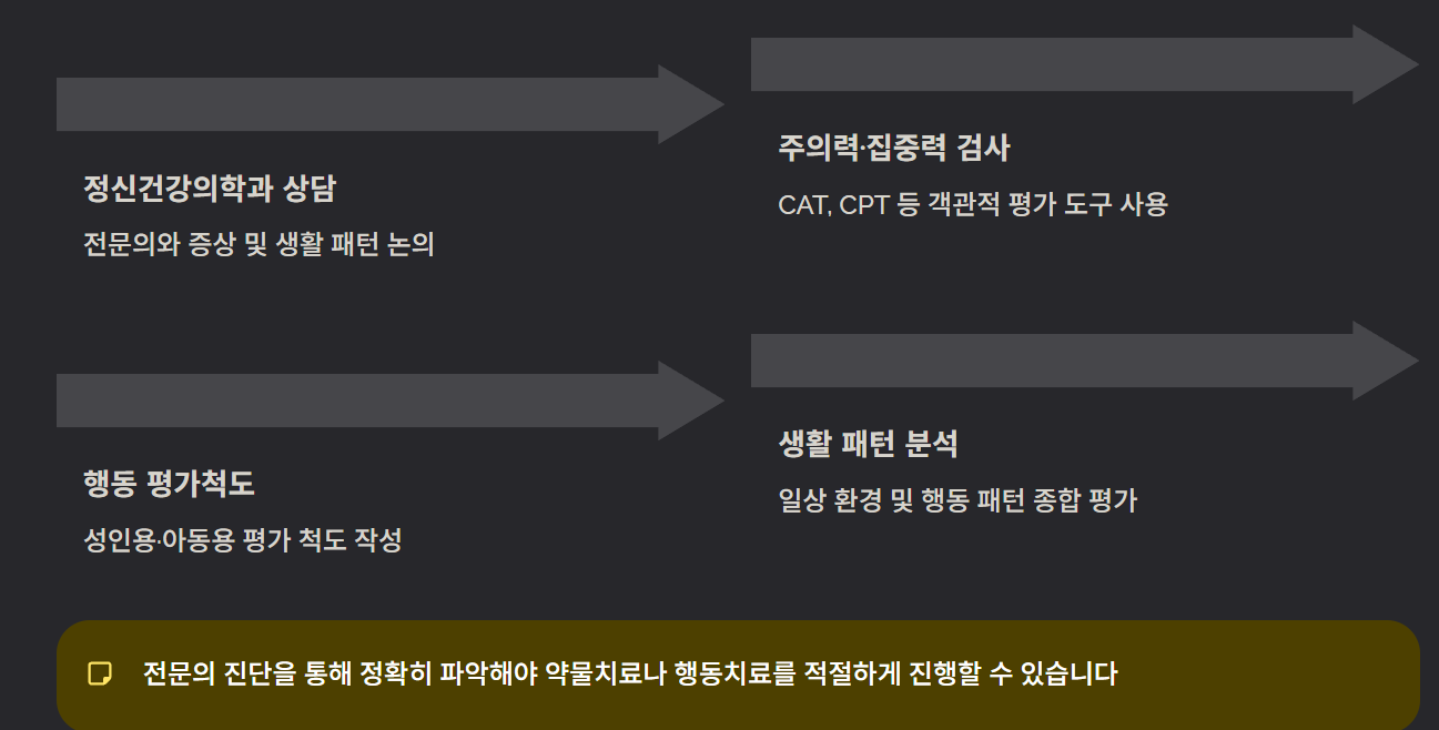 ADHD는 단순 자가진단으로 확정할 수 없으며 다음 전문 절차를 통해 평가합니다.