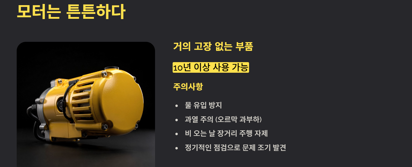 모터는 물 유입이나 과열이 고장의 주원인이므로 비 오는 날 장거리 주행과 과도한 오르막에서의 과부하를 피하는 것이 좋습니다.