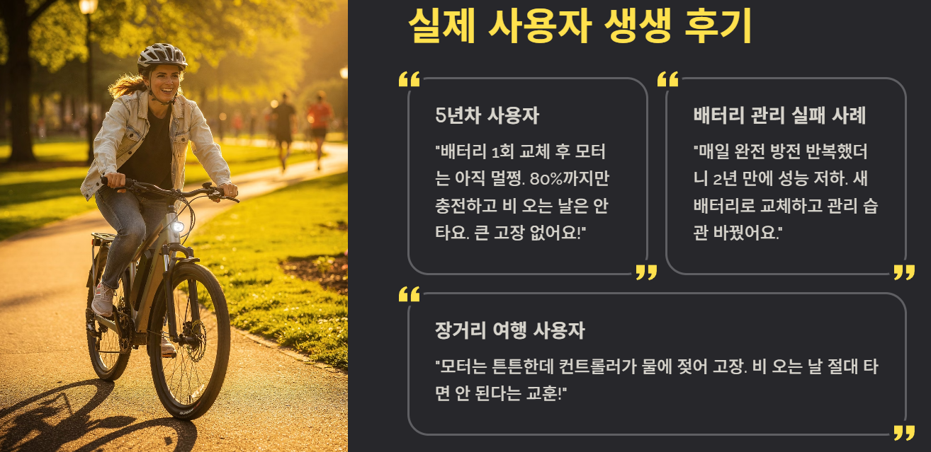 “배터리를 1회 교체했는데 모터는 아직 멀쩡해요. 평소 80%까지만 충전하고 비 오는 날은 거의 안 탑니다. 지금까지 큰 고장 없이 잘 사용 중!”