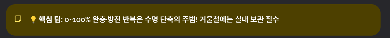 특히 배터리를 0%까지 완전히 방전시키는 행동은 수명 단축의 가장 큰 원인이므로 반드시 피해야 합니다.