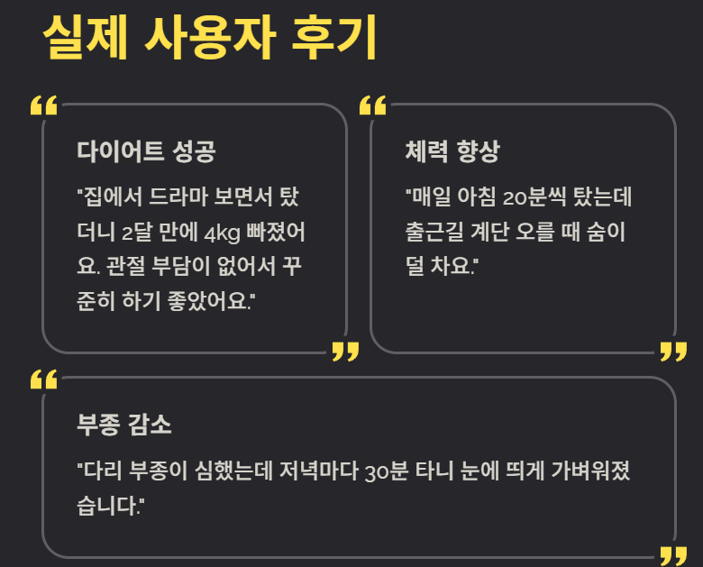 “집에서 드라마 보면서 탔더니 2달 만에 4kg 빠졌어요. 관절 부담이 없어서 꾸준히 하기 좋았어요.”