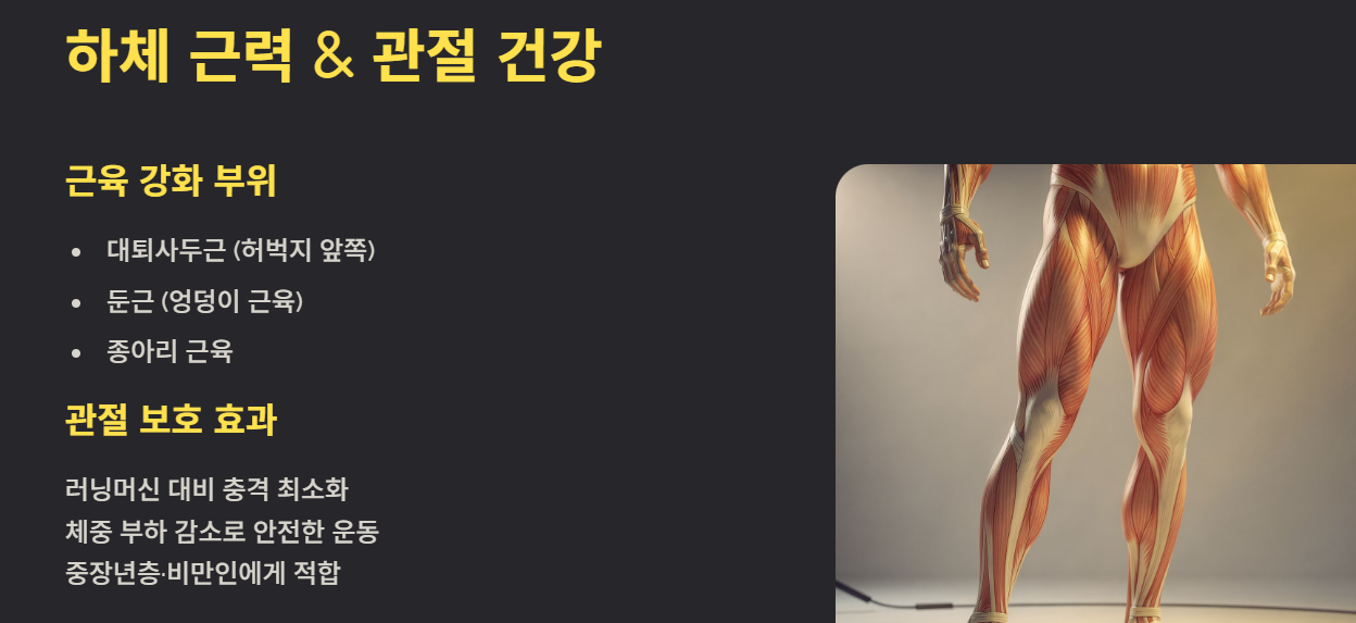 실내자전거는 러닝머신보다 관절 충격이 적어 무릎, 발목 부담이 줄어드는 운동입니다. 체중 부하가 적어 관절이 약한 중장년층, 비만인 분들도 비교적 안전하게 진행할 수 있습니다.