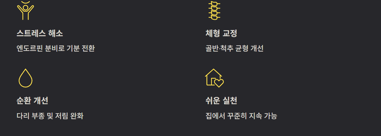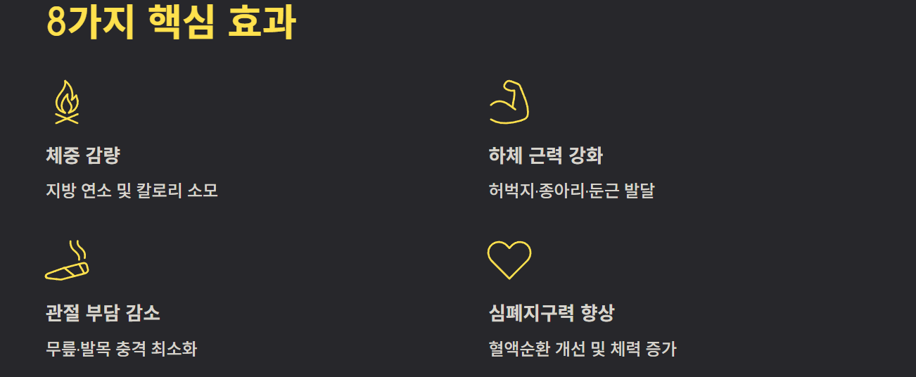 하체를 반복적으로 움직이면서 혈액순환이 좋아져 다리 부종 개선이나 저린 증상 완화에 도움이 됩니다. 장시간 앉아서 생활하는 직장인에게 특히 이점이 큽니다.