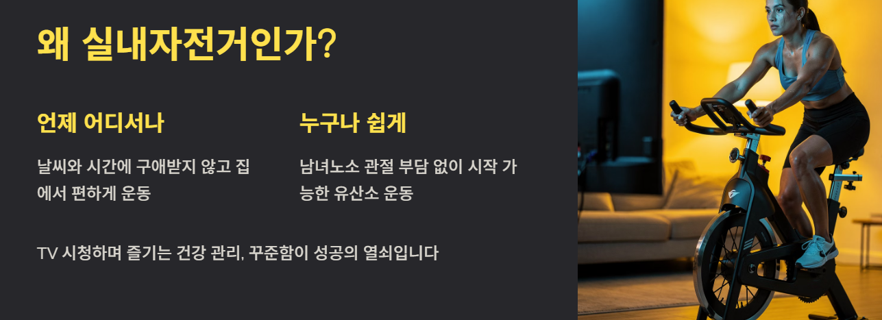 실내자전거는 다이어트, 심폐지구력, 근력 향상, 체형 교정, 부종 개선 등 다양한 효과를 가진 최고의 홈트 운동입니다. 무엇보다 관절 부담이 적어 남녀노소 누구나 시작할 수 있으며, TV를 보며 쉽게 지속할 수 있다는 점이 가장 큰 장점입니다. 꾸준히 실천한다면 체중 관리부터 건강 증진까지 확실한 변화를 경험할 수 있습니다.