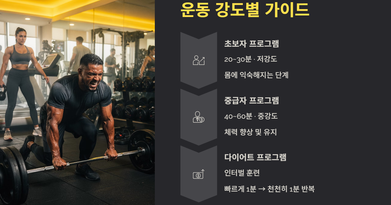 - 다이어트 목적: 인터벌 추천 (빠르게 1분 → 천천히 1분 반복)