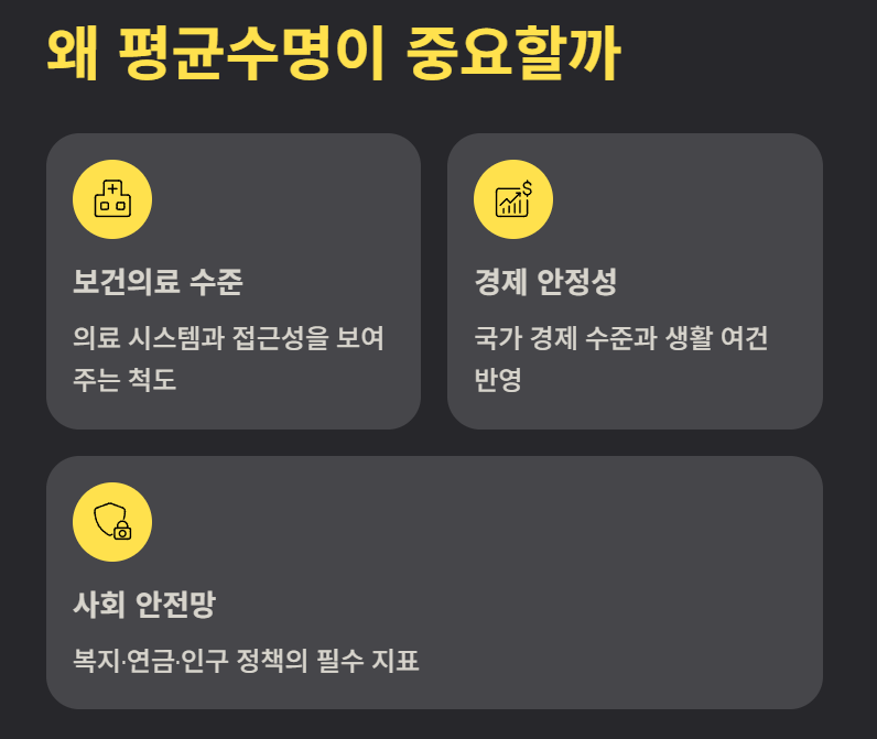 평균수명은 국가의 보건의료 시스템, 경제 수준, 사회 안전망을 종합적으로 보여줍니다. 이 수치가 높을수록 사회가 안정적이고 의료 접근성이 좋다는 의미가 됩니다. 또한 인구 정책, 복지 제도, 연금 설계에도 필수적인 지표입니다.