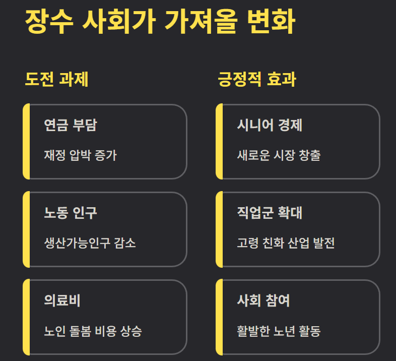 평균수명이 계속 상승하면 사회는 ‘초고령화’로 진입하게 됩니다. 이는 연금 부담 증가, 노동 인구 감소, 노인 의료비 증가 등 다양한 변화를 가져옵니다. 하지만 반대로 활발한 시니어 경제 활동, 새로운 직업군 증가 등 긍정적 효과도 함께 나타납니다.