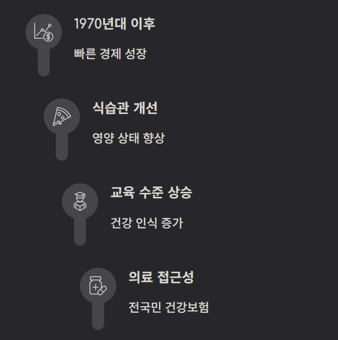 한국은 1970년대 이후 빠른 경제 성장과 의료 발전 덕분에 세계적으로 평균수명이 높은 나라에 속합니다. 특히 식습관 개선, 교육 수준 향상, 의료 접근성 강화가 큰 역할을 했습니다. 최근에는 80세 후반까지도 평균수명이 도달할 수 있다는 전망이 나옵니다.