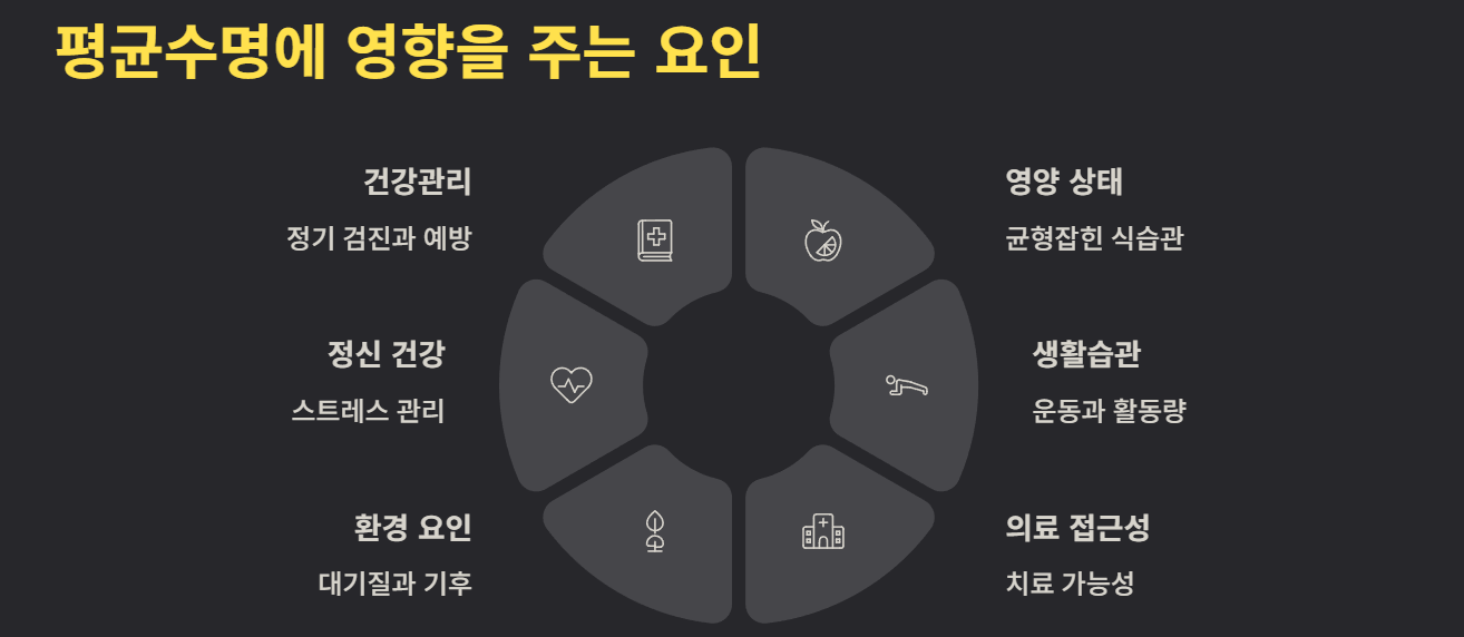 평균수명에 대해 막연하게 알고 있었지만, 이번에 정리하면서 국가·사회·개인의 삶을 모두 연결하는 중요한 지표라는 것을 새롭게 깨달았습니다. 앞으로 건강 관리뿐 아니라 사회 변화에도 관심을 더 가져야겠다는 생각이 들었습니다.