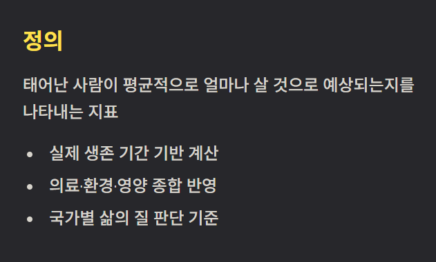 - 기대수명: 특정 연령대가 앞으로 몇 년을 더 살 수 있는지 예측한 수치