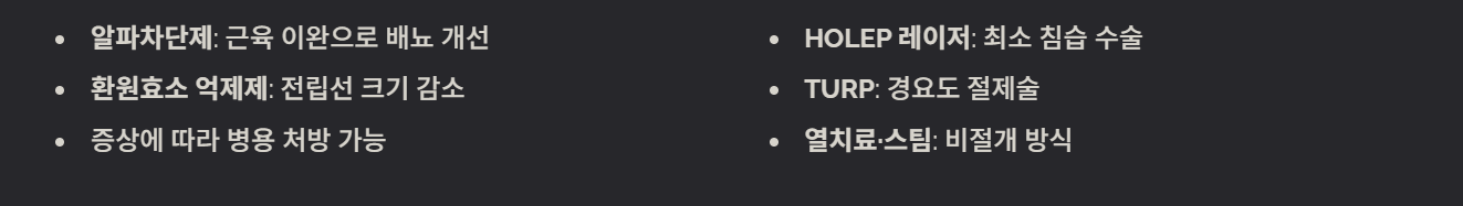 - 알파차단제: 근육 이완 → 배뇨 증상 개선