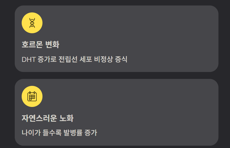 전립선비대증은 주로 남성 호르몬 변화와 노화가 핵심 원인이다. 특히 디하이드로테스토스테론(DHT)이 증가하면서 전립선 세포가 비정상적으로 증식하게 된다. 가족력, 비만, 운동 부족, 스트레스도 발병 위험을 높인다.