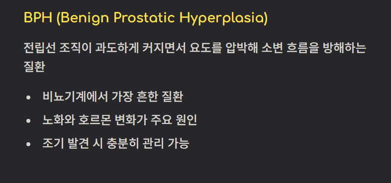 전립선비대증(BPH)은 전립선 조직이 과도하게 커지면서 요도를 압박해 소변 흐름을 방해하는 질환이다. 비뇨기계 중 가장 흔한 질환 중 하나로 알려져 있으며, 노화·호르몬 변화가 주요 원인으로 꼽힌다.