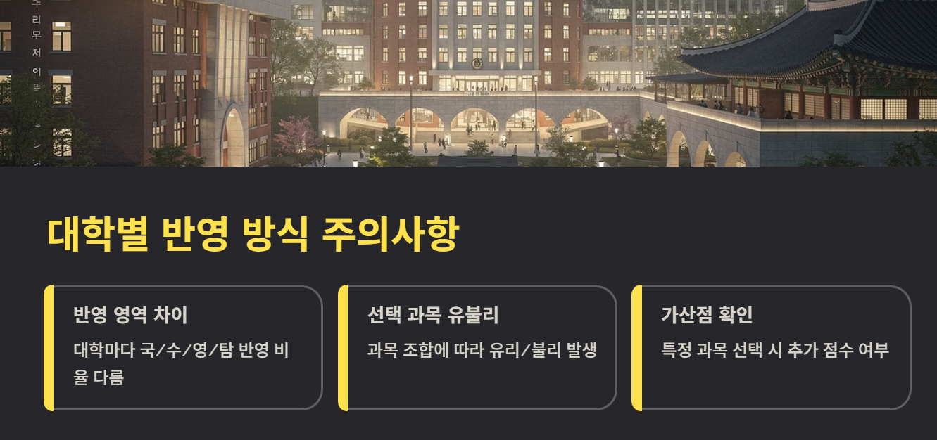 - 지원하고자 하는 대학의 환산 점수표 적용해 모의 지원해보기 — 대학별 반영 방식 다르므로 주의