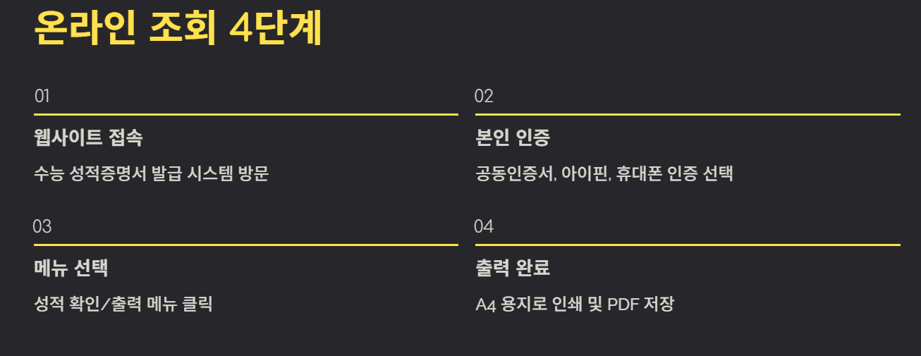 최근 동향을 보면, 수능 성적표는 시험 후 약 3~4주 뒤에 배부되며, 온라인 조회와 출력, 그리고 학교 배부를 통해 받을 수 있게 됩니다.