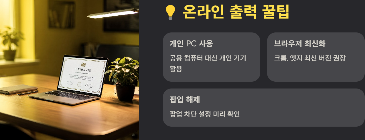 💡 팁: 공용 PC 대신 개인 PC/노트북 사용, 브라우저 최신화, 팝업 차단 해제 등 보안/호환성 주의