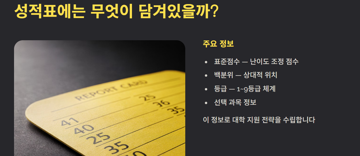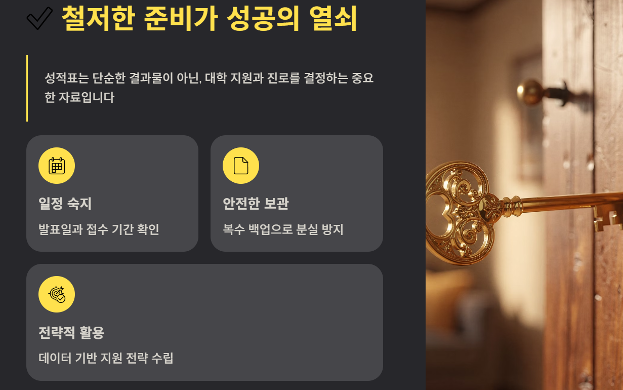 성적표는 단순한 결과물이 아니라, 앞으로의 대학 지원과 진로를 결정하는 중요한 자료입니다 — 철저히 관리하고 잘 활용하시길 바랍니다.