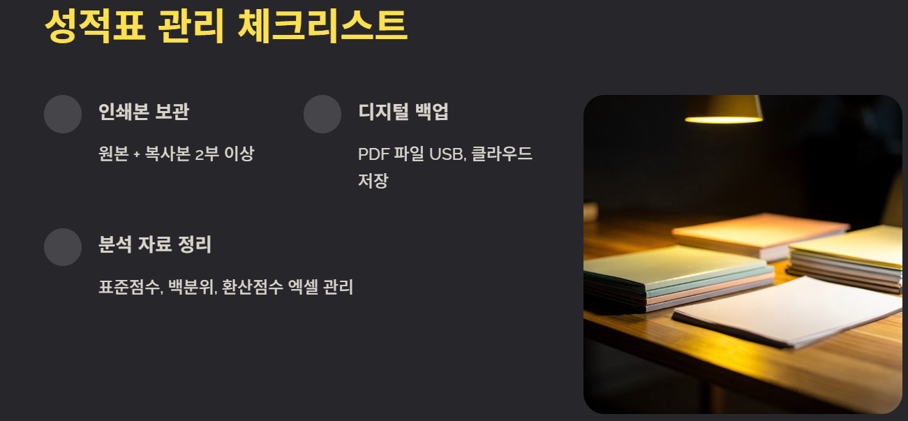 - 성적표 인쇄본 분실 방지 — 복사본 1~2부 출력, PDF 파일 보관