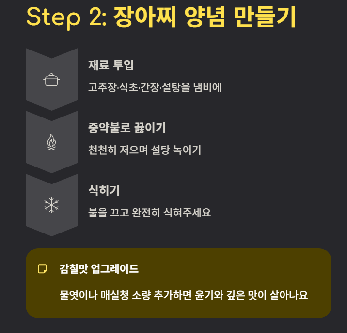 장아찌 소스는 불에 한 번 살짝 끓여야 깊은 맛이 배고 잡내가 사라집니다.