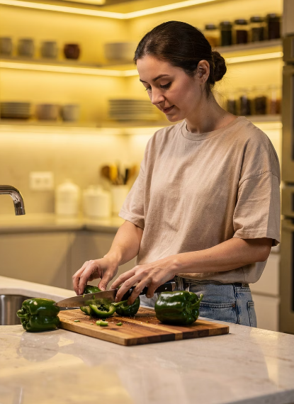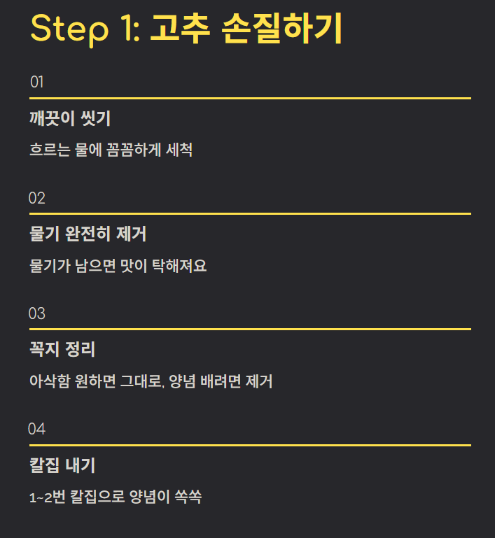 - 칼집 내기: 한두 번 칼집을 넣으면 고추 내부까지 양념이 빠르게 배어 깊은 맛이 납니다.