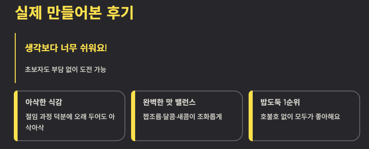 - 물엿이나 매실청을 소량 더 넣으면 감칠맛과 윤기가 살아납니다.