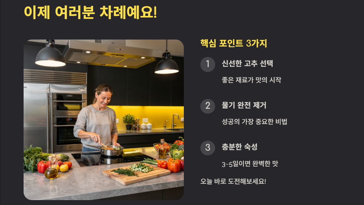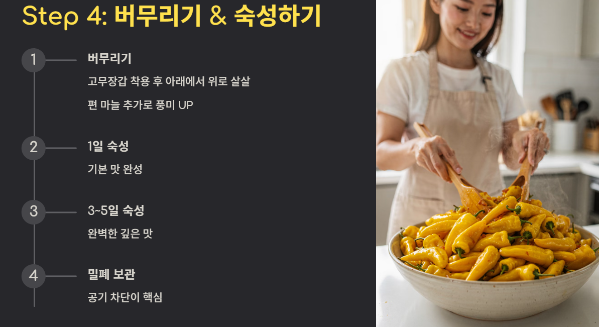숙성이 완료되면 짭짤하고 달콤하며 고추 향이 살아 있는 완벽한 장아찌가 완성됩니다.
