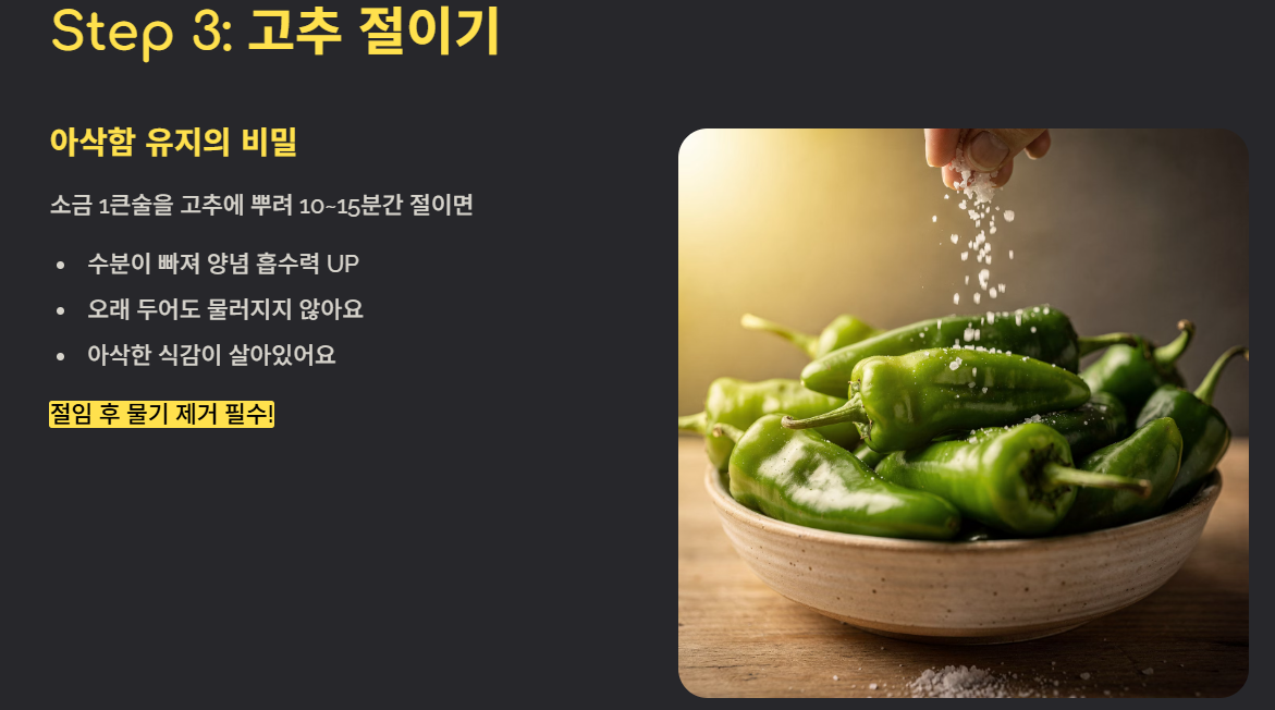 고추장아찌에서 고추의 아삭거림을 유지하려면 잠깐 소금에 절이는 과정이 필수입니다.