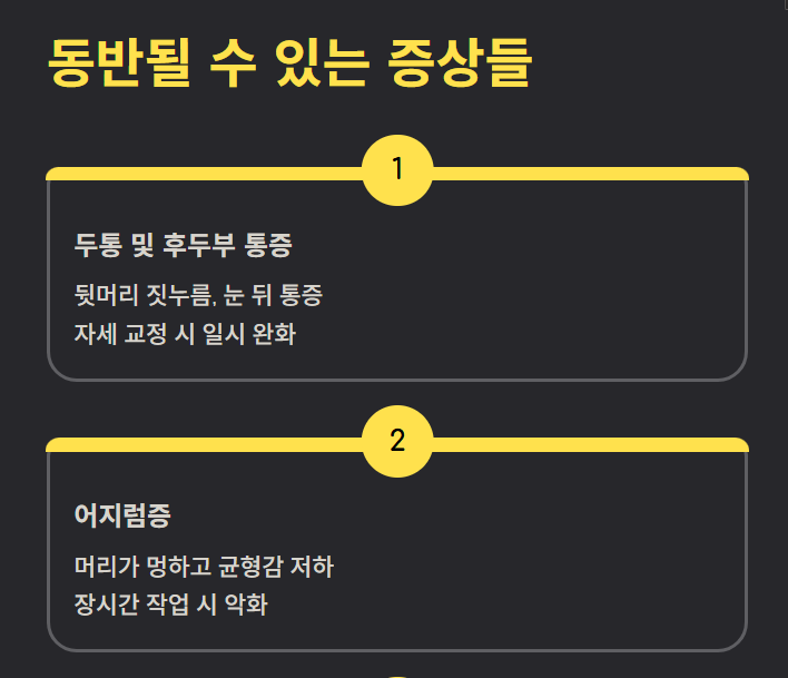 경추 주변 혈관과 신경이 자극되면 어지럼증, 머리가 멍함, 균형감 저하가 동반될 수 있습니다. 오래 앉아서 컴퓨터 작업을 하는 직장인에게 흔히 나타납니다.