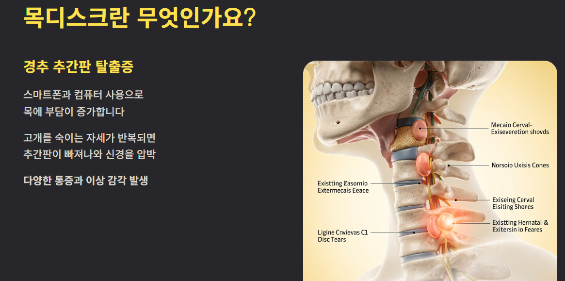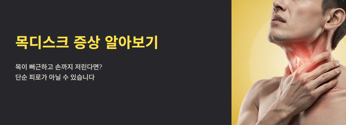 목이 뻐근하고 손까지 저린 느낌이 든다면 단순한 피로가 아니라 **목디스크(경추 추간판 탈출증)**의 시작일 수 있습니다. 현대인은 스마트폰과 컴퓨터 사용 시간이 길어지면서 목에 큰 부담을 주고 있습니다. 특히 고개를 숙이는 자세가 반복되면 추간판이 빠져나와 신경을 누르게 되고, 다양한 통증과 이상 감각이 나타나게 됩니다.