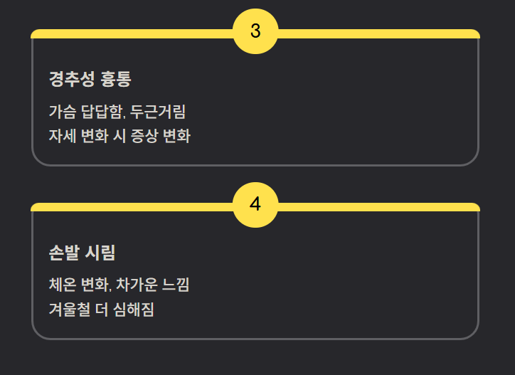 신경이 지속적으로 눌릴 경우 손발이 차가워지거나 시림이 생기는 자율신경계 증상이 나타날 수 있습니다. 특히 겨울철이나 장시간 같은 자세를 유지했을 때 더 심해질 수 있습니다.