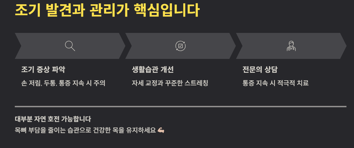 목디스크는 단순한 피로라고 넘기기 쉬우나, 방치하면 손 저림·두통·근력 저하 등 일상생활에 큰 지장을 줄 수 있습니다. 하지만 초기 증상만 잘 파악하고, 생활습관과 스트레칭을 꾸준히 하면 대부분 자연 호전 가능합니다. 목뼈에 부담을 주는 습관을 개선하고, 통증이 지속될 때는 전문의 상담을 받는 것이 가장 확실한 방법입니다.