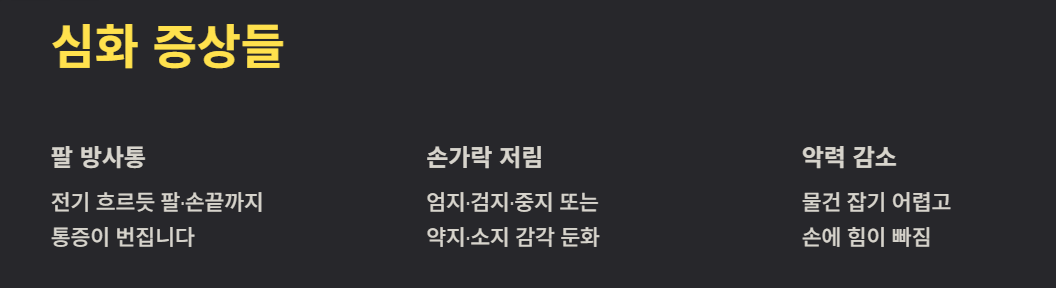 물건을 잡기 어렵거나, 손에 힘이 빠지는 느낌이 들면 신경 압박이 더 심해진 상태일 수 있습니다. 이 단계에서는 일상생활에 불편이 생기며, 조기 치료가 중요해집니다.
