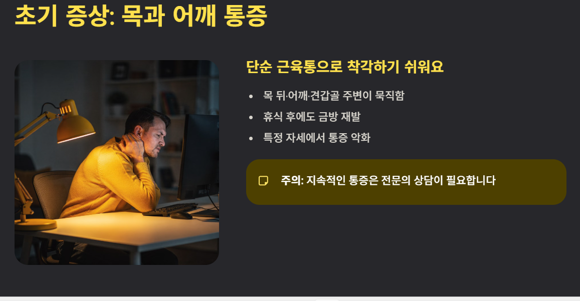 목디스크 초기에는 단순한 근육 통증으로 착각하는 경우가 많습니다. 특히 목 뒤·어깨·견갑골 주변이 당기거나 묵직한 느낌이 자주 나타납니다. 휴식을 취해도 금방 재발하거나, 특정 자세를 취하면 통증이 심해지는 것이 특징입니다.