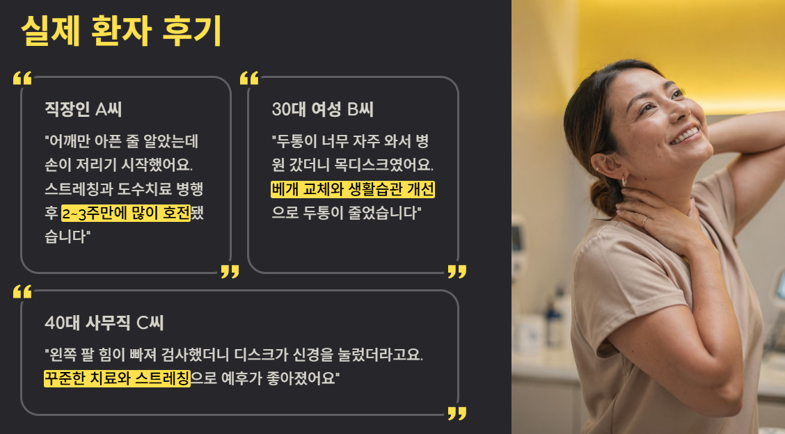 “어깨만 아픈 줄 알았는데 손이 저리기 시작하면서 목디스크 진단을 받았어요. 스트레칭과 도수치료 병행했더니 2~3주만에 많이 좋아졌습니다.”