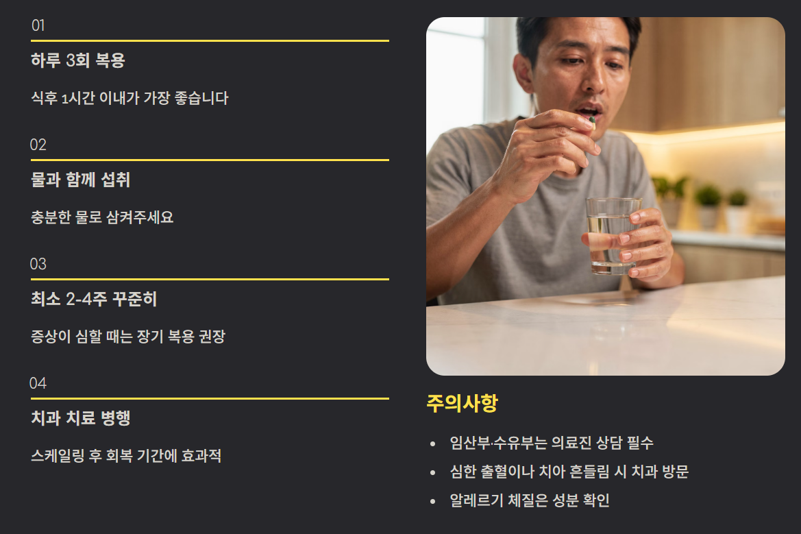 - “스케일링 후 잇몸이 헐었는데 복용하니 회복이 빨랐다.”