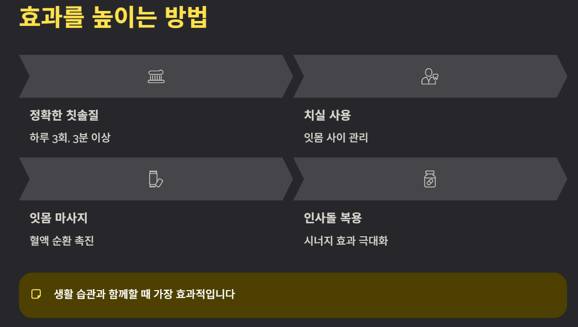 인사돌은 단독으로도 도움이 되지만, 정확한 칫솔질 + 치실 사용 + 잇몸 마사지와 함께 병행하면 시너지 효과가 큽니다. 특히 잇몸 사이 깊숙한 곳은 약만으로 해결하기 어려우므로 생활 습관과 병행하는 것이 중요합니다.