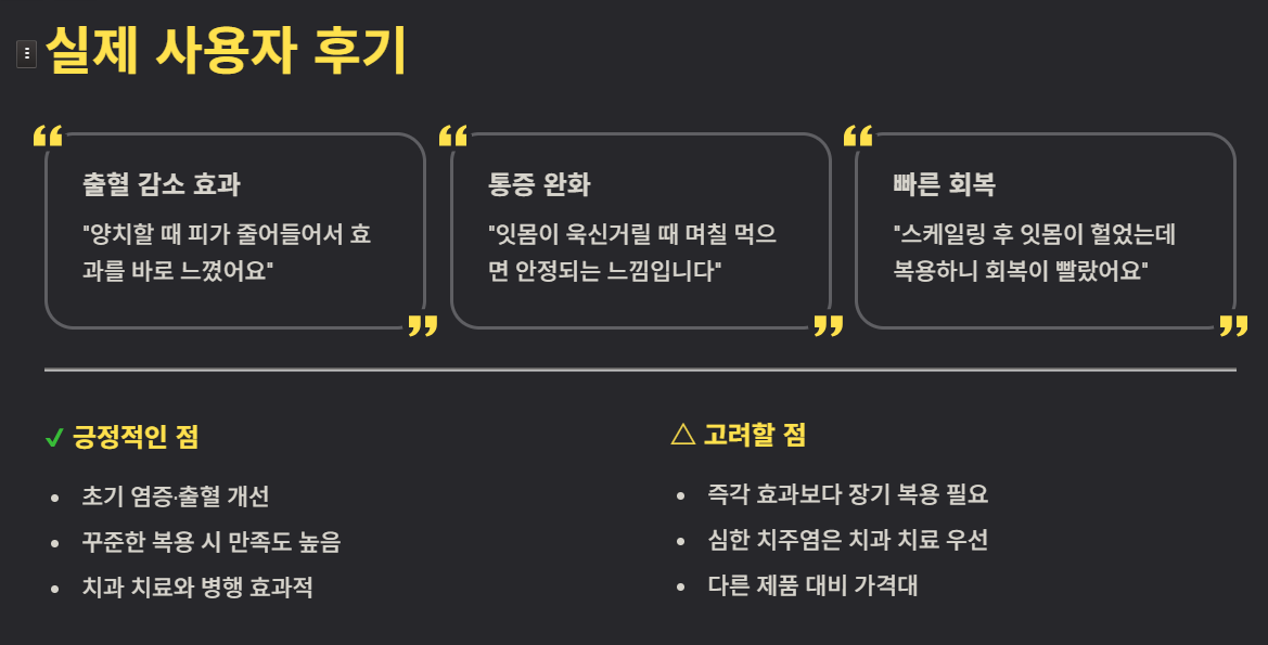 - 치과 치료 병행 가능: 스케일링 후 회복 기간에 함께 섭취하면 잇몸이 빨리 안정된다는 후기가 있음