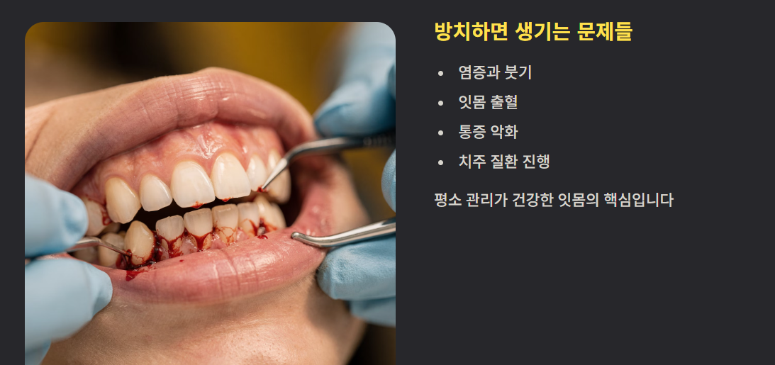 - 잇몸 출혈이 매우 심하거나 치아 흔들림이 있을 경우 치과 진단 우선