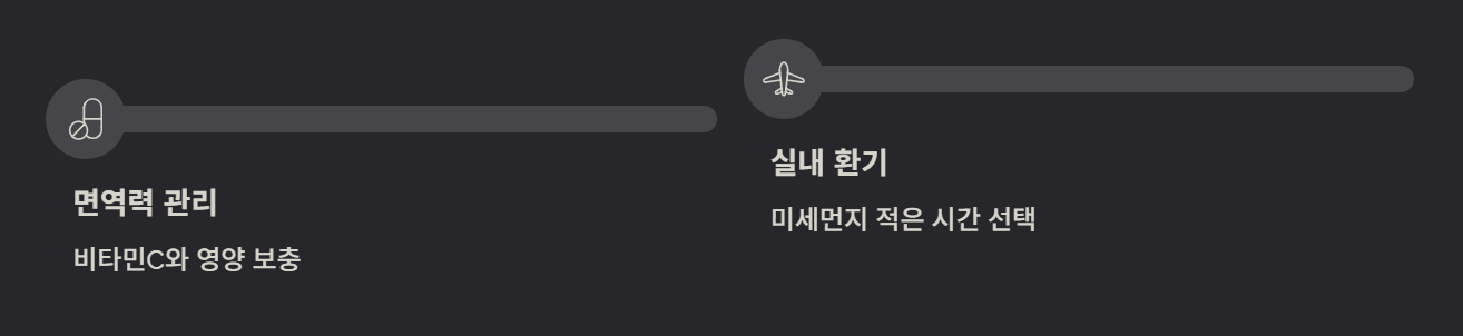 얇은 옷을 여러 겹 겹쳐 입는 것이 좋습니다. 충분한 수분 섭취와 면역력 관리가 필요하며, 실내 환기를 통해 미세먼지를 줄여야 합니다.