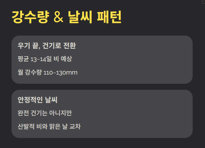 - 따라서 “완전 건기”라고 보긴 어렵지만, 잦은 소나기보다는 산발적인 비와 간헐적 맑은 날이 번갈아 오는 편입니다.