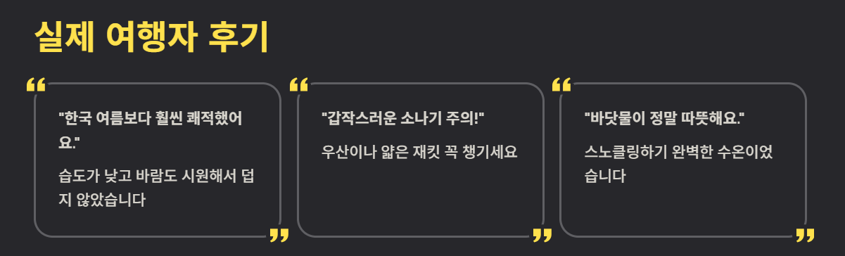 - 바닷물은 따뜻했고 해양 액티비티는 매우 만족스러웠다는 후기가 많아, 수영이나 스노클링을 기대했다면 대체로 좋은 경험이었다는 평가가 많습니다.