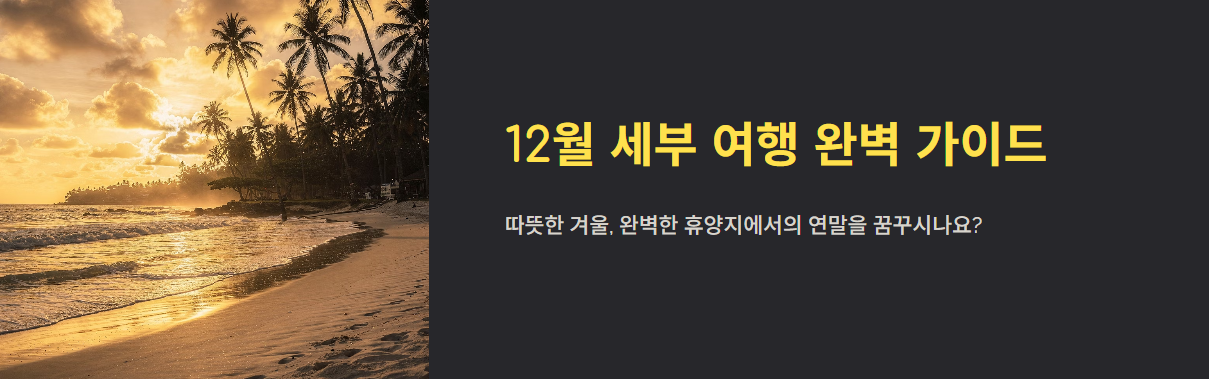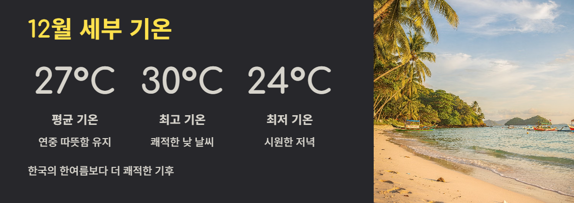 12월의 세부는 연말여행과 휴양을 동시에 즐기려는 여행자에게 매우 매력적인 시기입니다. 북반구의 겨울과 달리, 세부에서는 따뜻한 기후와 여유로운 분위기가 공존해 ‘다른 계절의 휴양지’ 같은 느낌을 줍니다. 특히 12월은 우기가 끝나고 비교적 쾌적한 날씨가 찾아와 해양 액티비티나 관광을 계획하기에 좋은 기후 조건을 제공합니다.