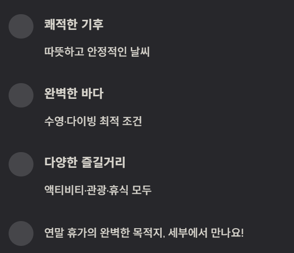 - 또한 기온이 높고 날씨가 무난해 관광지, 맛집, 쇼핑 등을 여유롭게 즐기기 좋습니다.