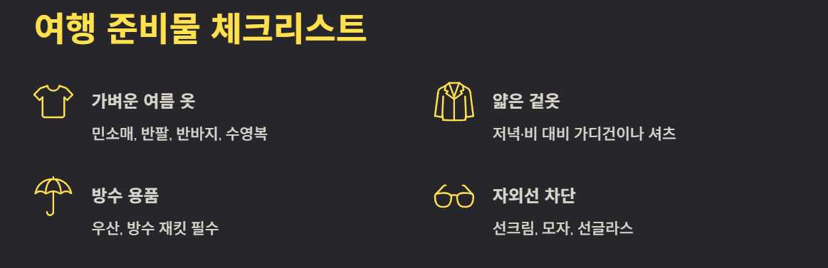 - 낮 기온이 높고 습하기 때문에 민소매, 반팔, 반바지, 수영복 같은 가벼운 옷이 적합합니다.
