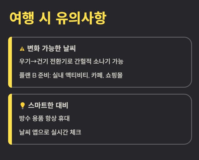 - 따라서 여행 계획을 짤 때 ‘비 오는 날 플랜 B’를 준비해 두는 것이 좋습니다. 예: 실내 액티비티, 카페, 쇼핑 등