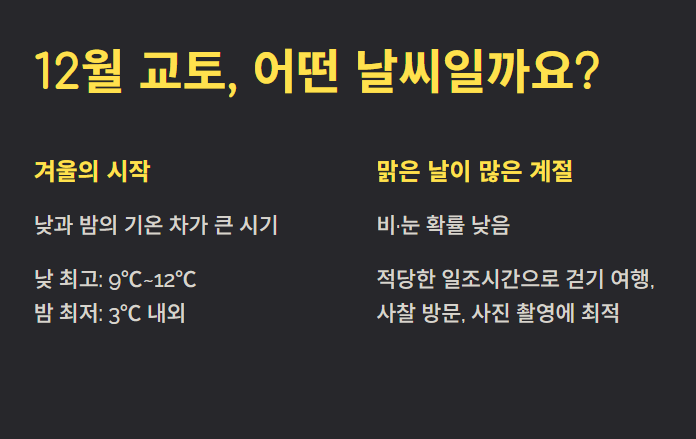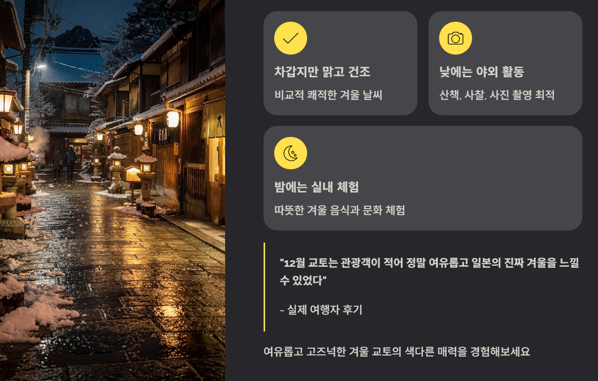 12월 교토는 차갑지만 비교적 맑고 건조한 겨울 날씨로 여행하기 좋은 시즌입니다. 낮에는 산책, 사찰 방문, 사진 촬영이 편하고, 밤에는 따뜻한 실내 체험과 겨울 음식으로 교토의 색다른 매력을 느낄 수 있습니다. 체험 후기처럼 여유롭고 고즈넉한 겨울 교토를 기대해도 좋습니다.