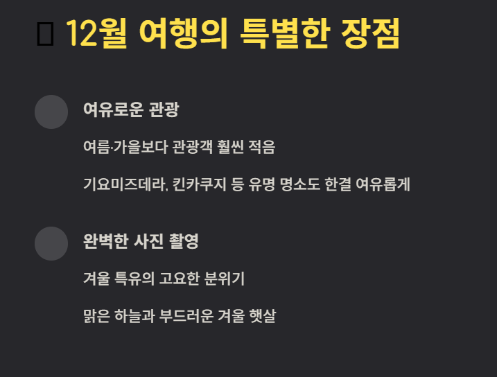 12월은 여름이나 가을보다 관광객이 훨씬 적어 유명 명소(예: 기요미즈데라, 킨카쿠지)도 한결 여유롭게 즐길 수 있습니다. 겨울 특유의 고요한 분위기와 맑은 하늘이 사진 찍기에 아주 좋다는 여행 후기들이 많습니다.