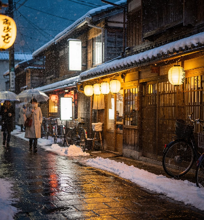 교토 시내 중심에서는 눈이 많이 오지 않지만, 북쪽 지역이나 주변 산간 지역으로 가면 눈 덮인 풍경을 볼 확률이 더 높습니다. 특히 연말로 갈수록 겨울 느낌이 강해지는 풍경을 만날 수 있어요.