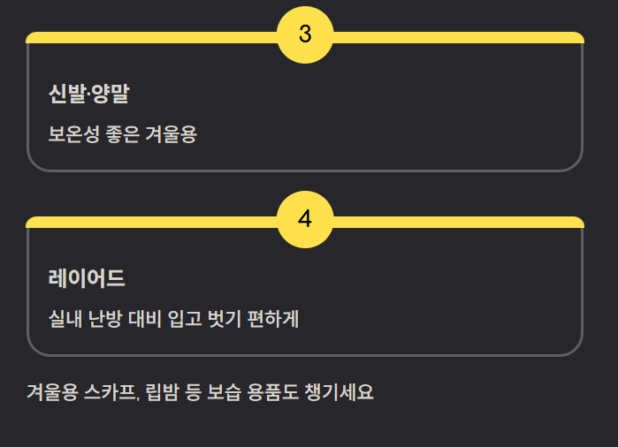 겨울용 스카프, 립밤 등의 보습 용품도 있으면 좋습니다.